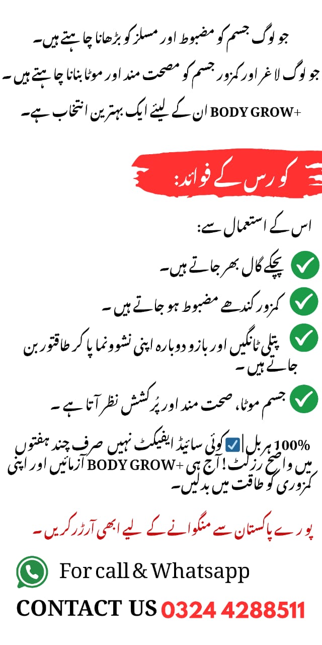 Muja tifid Howa tha jis ki wja sy man Boht zada week ho gya tha fir mny ya body Grow+ use 1 mhiny mn mara jis acha khasa grow ho gya h muja 1 or parsal kr den . -